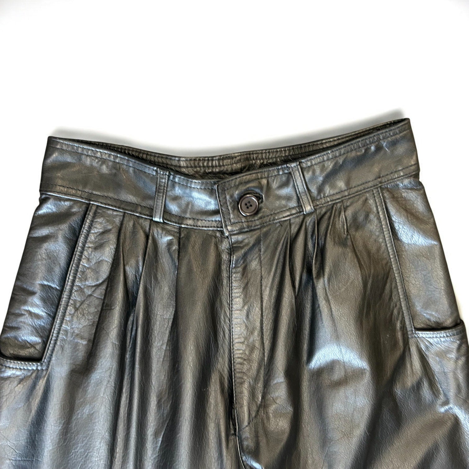 Own a piece of bold 1980s fashion with these vintage genuine leather pants, made in Korea and fully lined for comfort. Designed with a high-rise pleated waist and tapered legs, they offer a structured yet edgy silhouette. The black leather finish is buttery-soft and slightly broken in β perfect for modern styling.